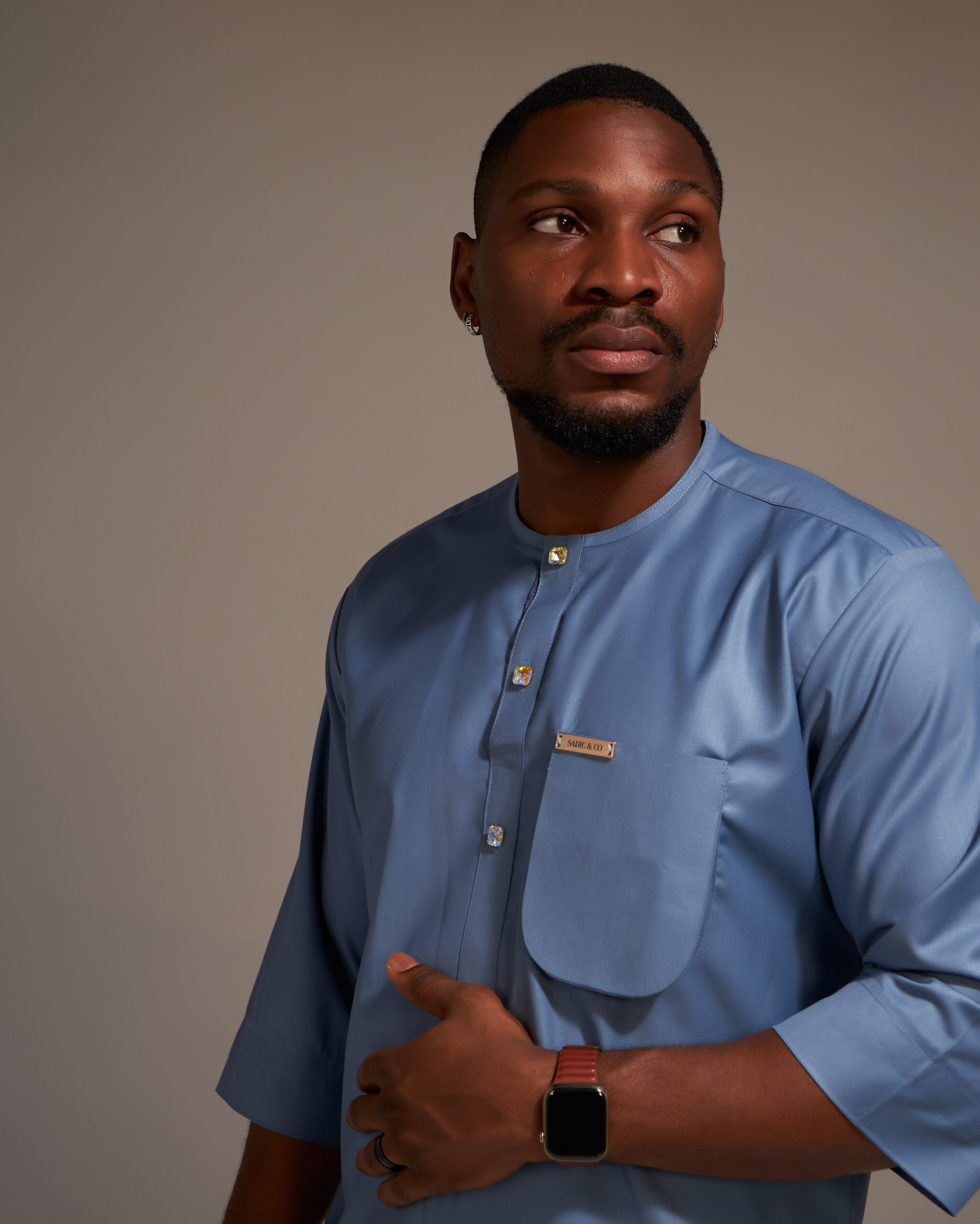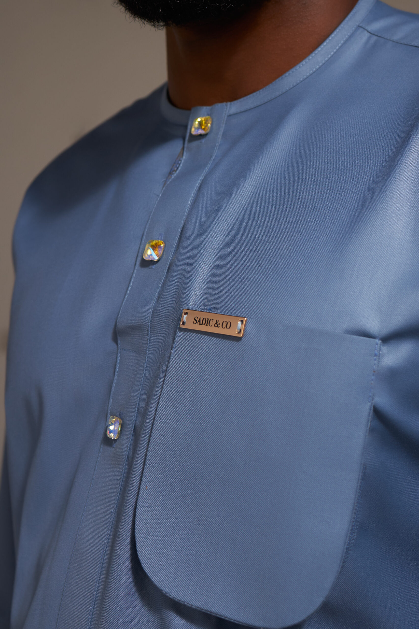 Baby Blue wool 3/4 sleeve kaftan, straight cut pants, patch pocket, swarovski buttons
