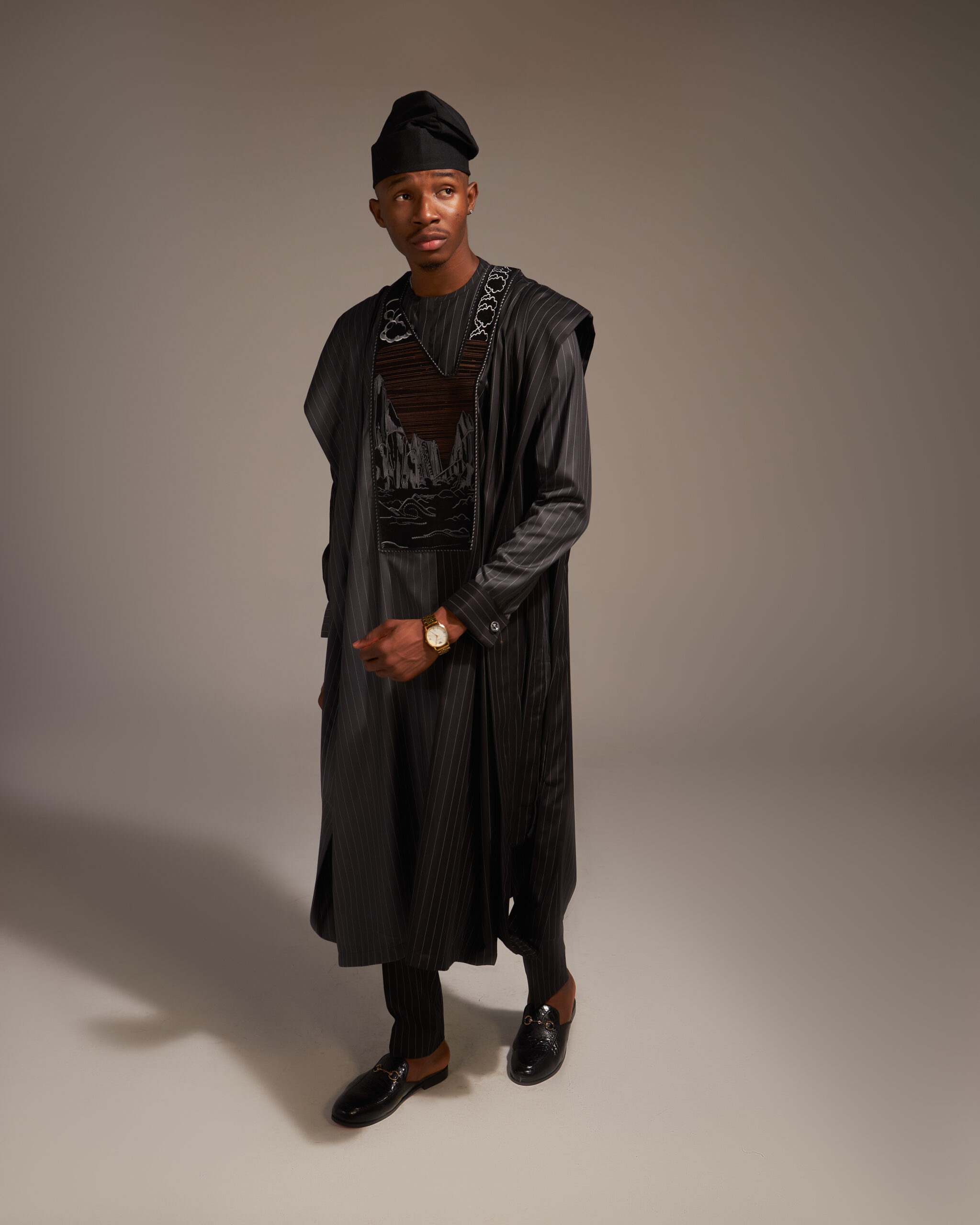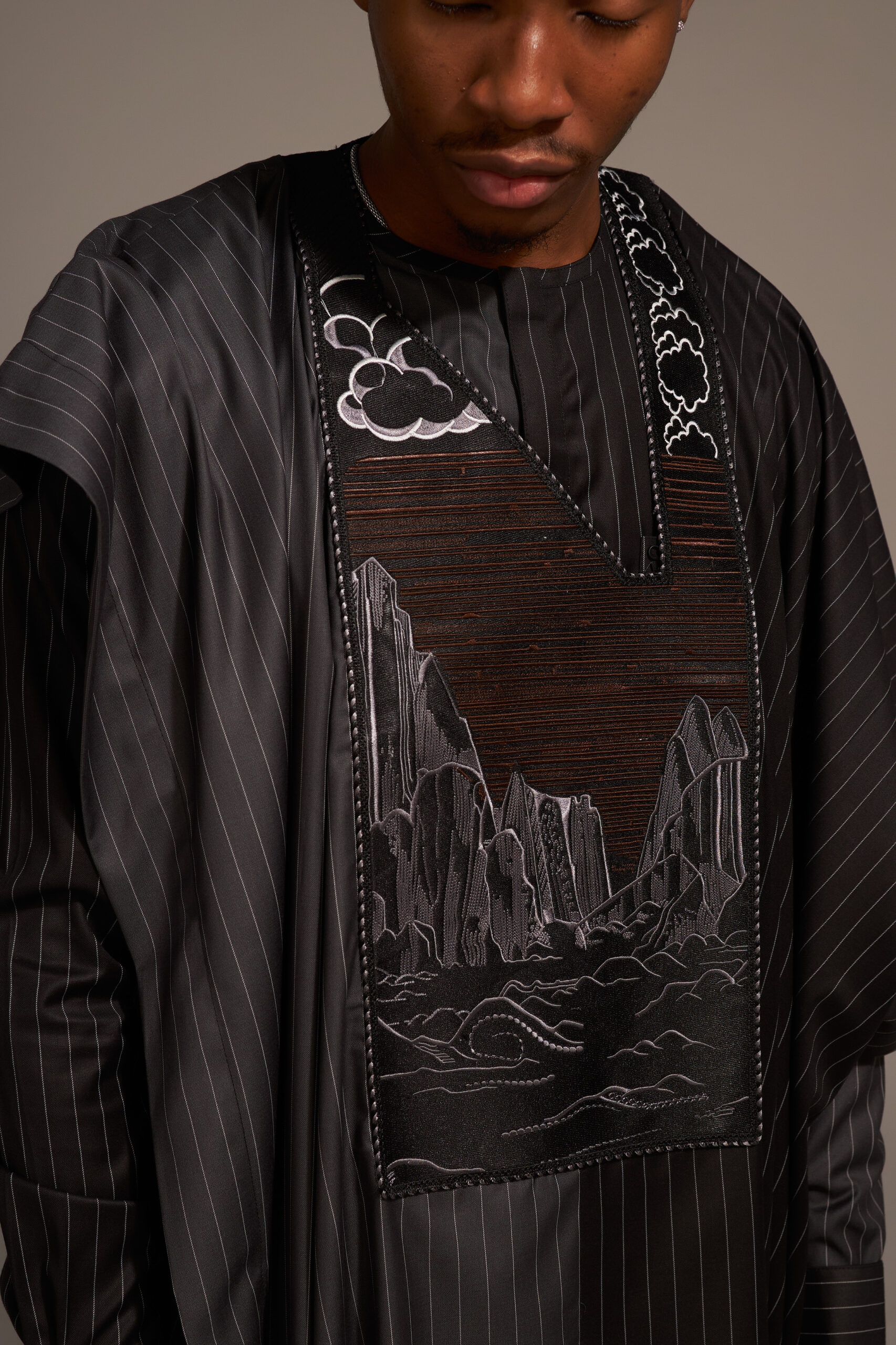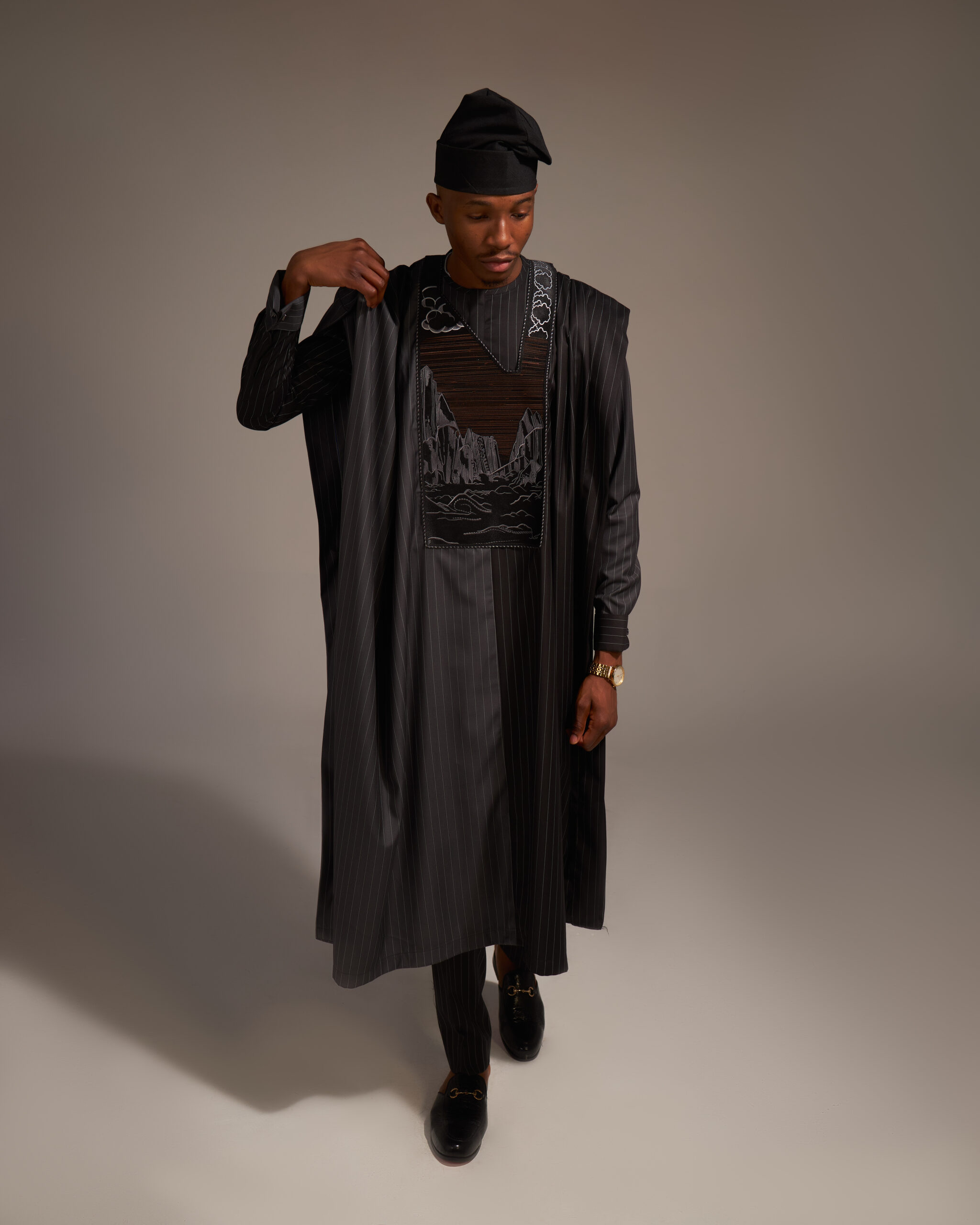 Black & Grey pinstripe wool Agbada, Long sleeve Kaftan Buba, Slim cut Sokoto pants