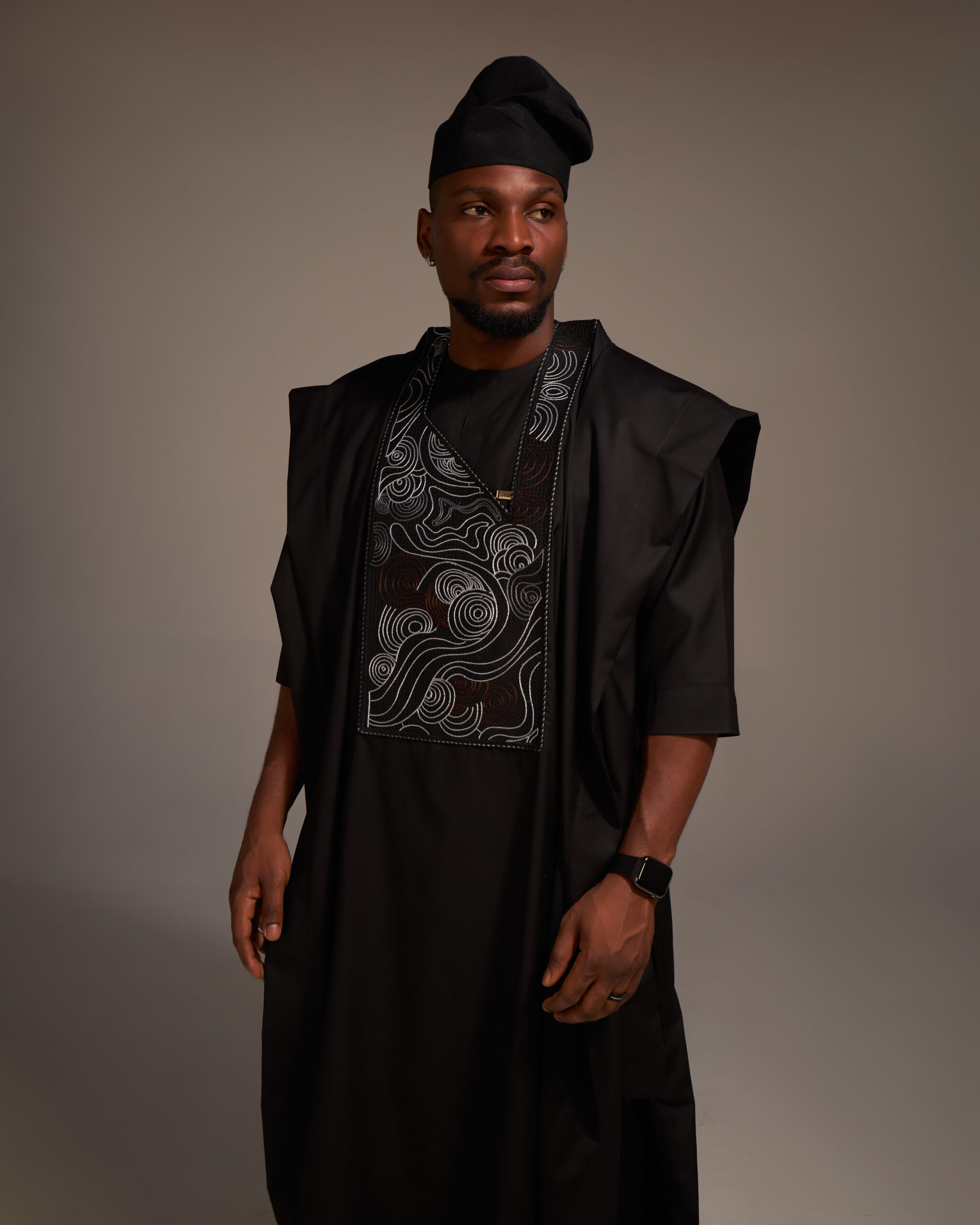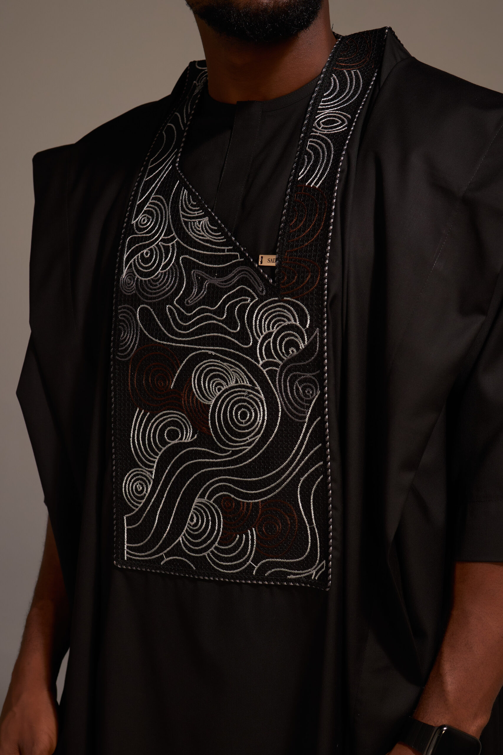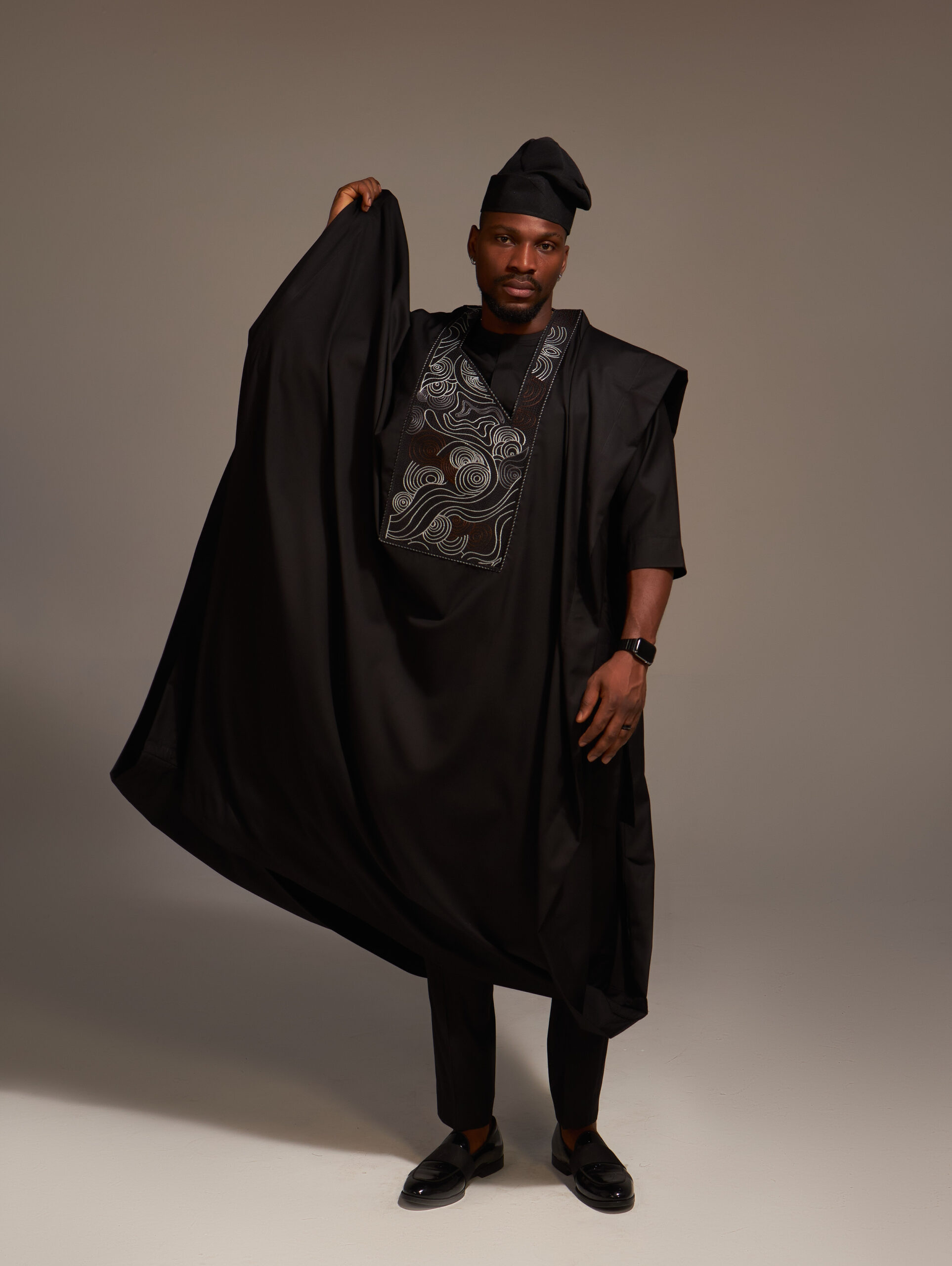 Black wool Agbada, 3/4 sleeve Kaftan Buba, Slim cut Sokoto pants