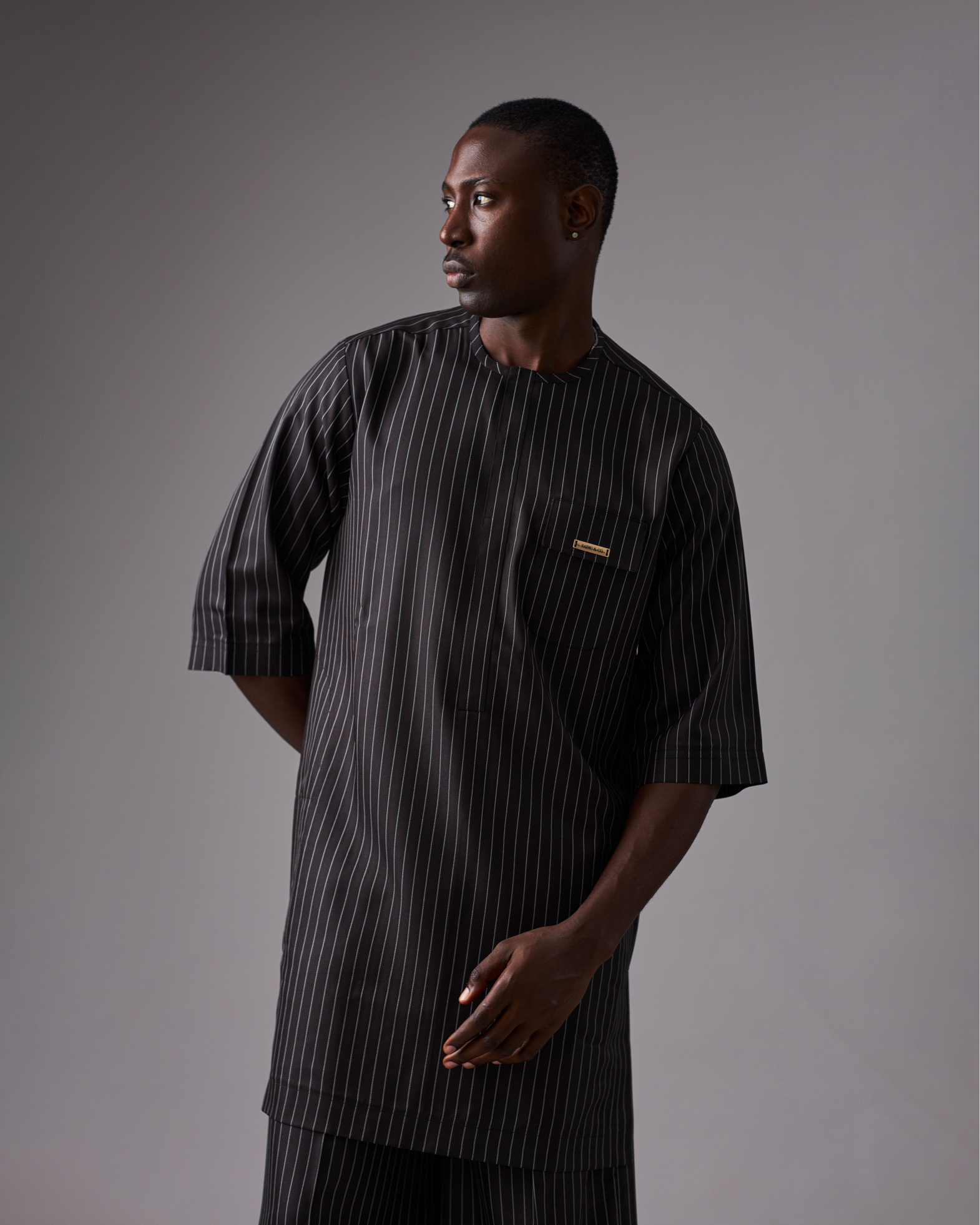 Black pinstripe wool 3/4 sleeve kaftan, Wide leg 3/4 pants, Covered patch pocket