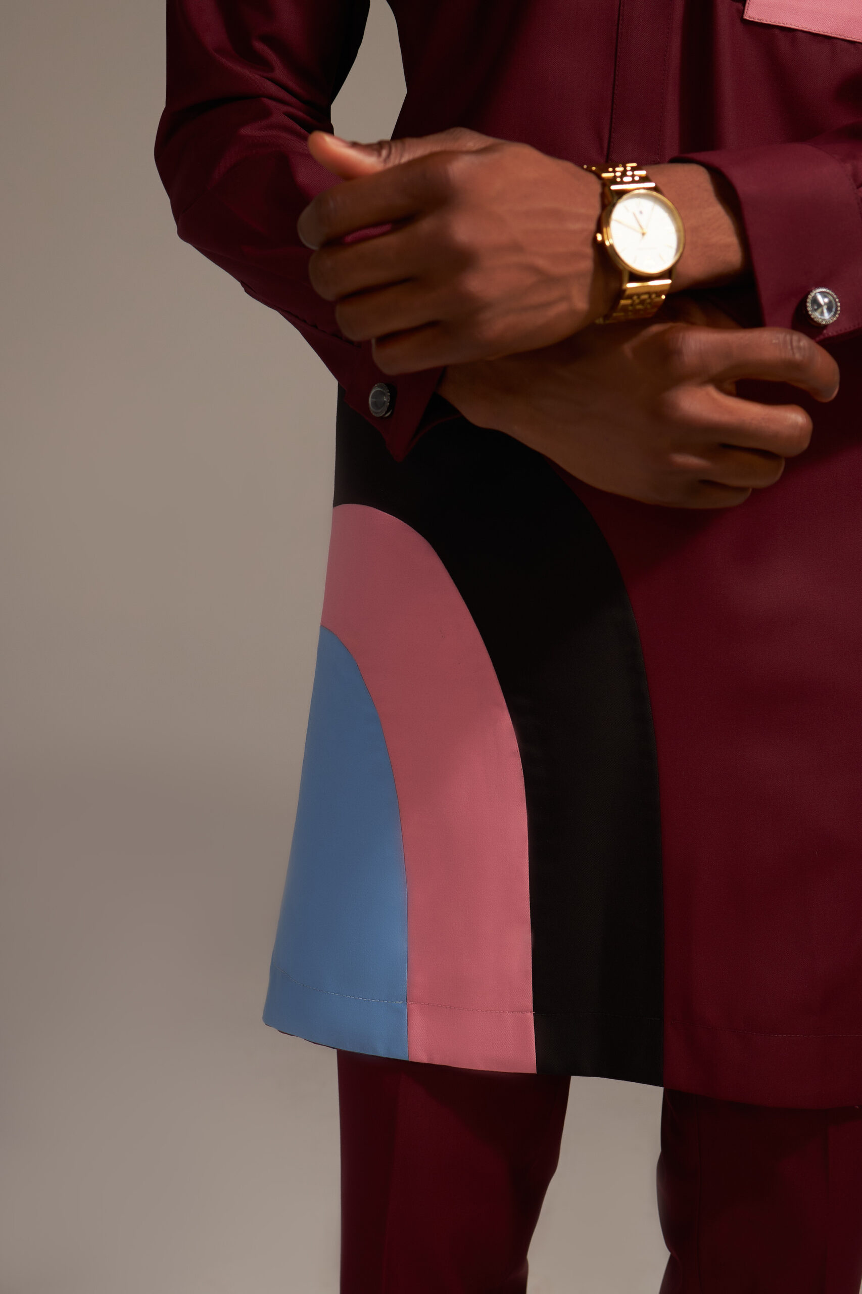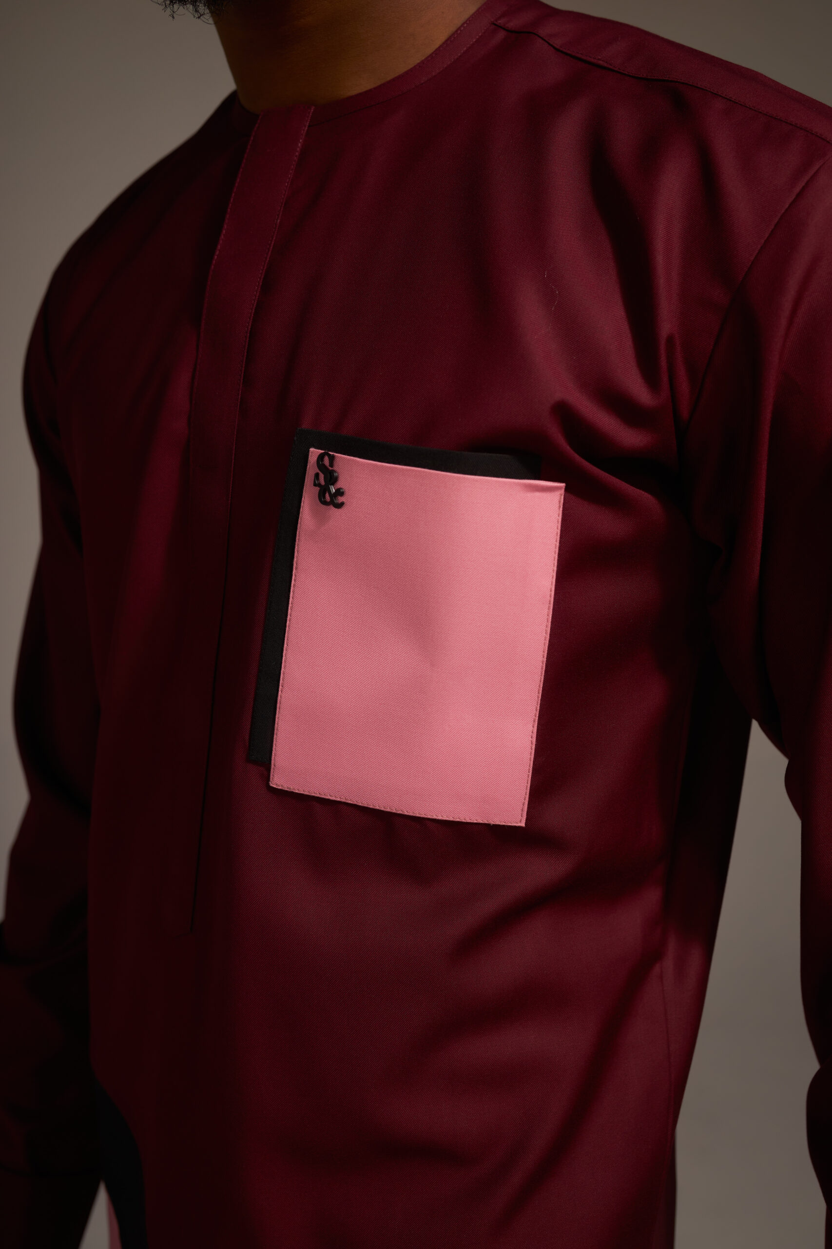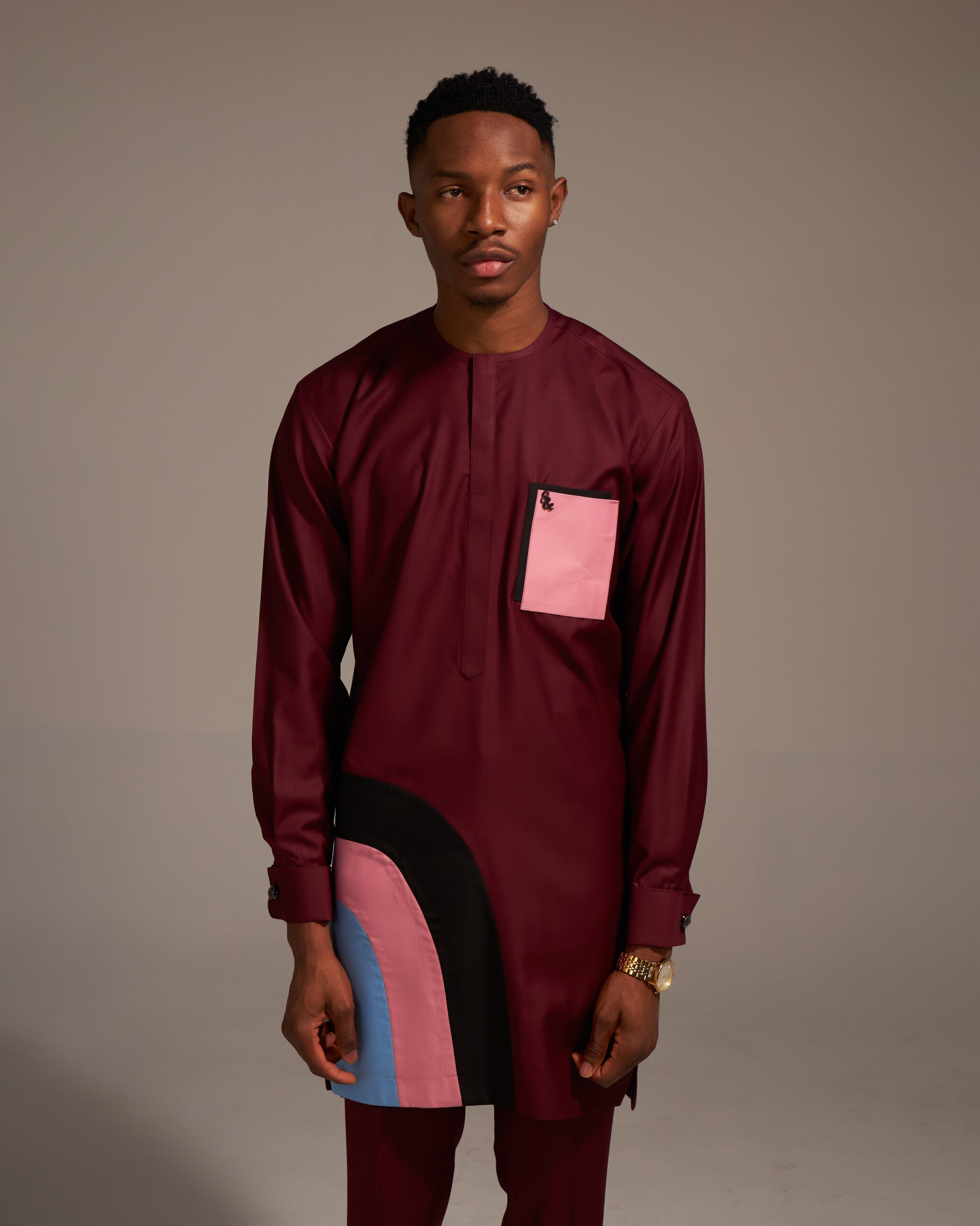 Burgundy wool long sleeve kaftan with baby blue, pink and black curve patches, burgundy straight cut pants, baby pink and black patch pocket