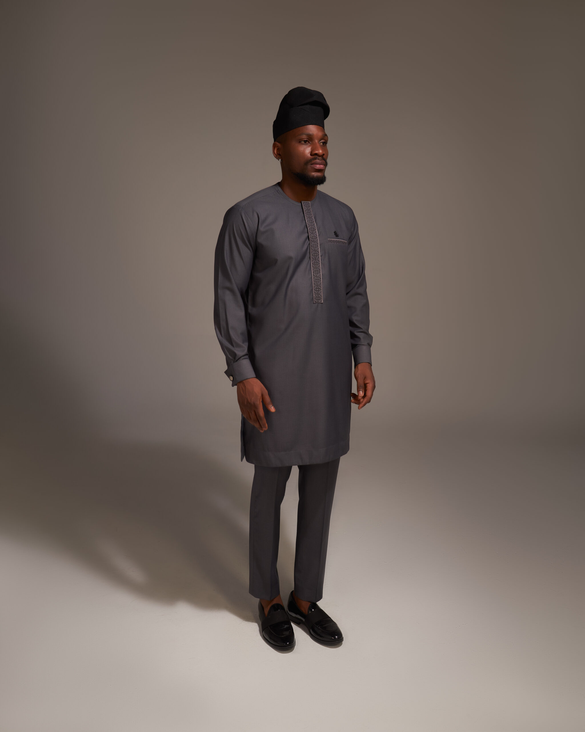Charcoal Grey wool long sleeve kaftan, straight cut pants, embroidered placket and pocket