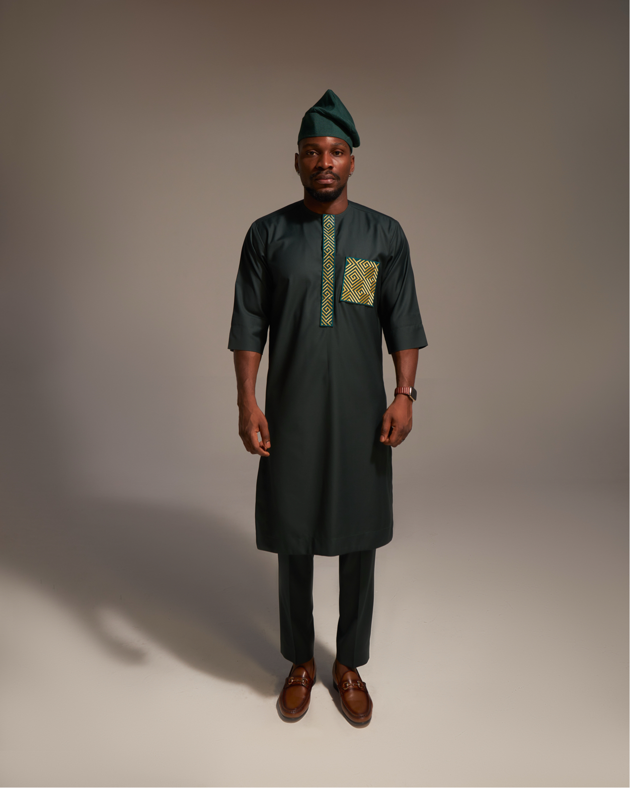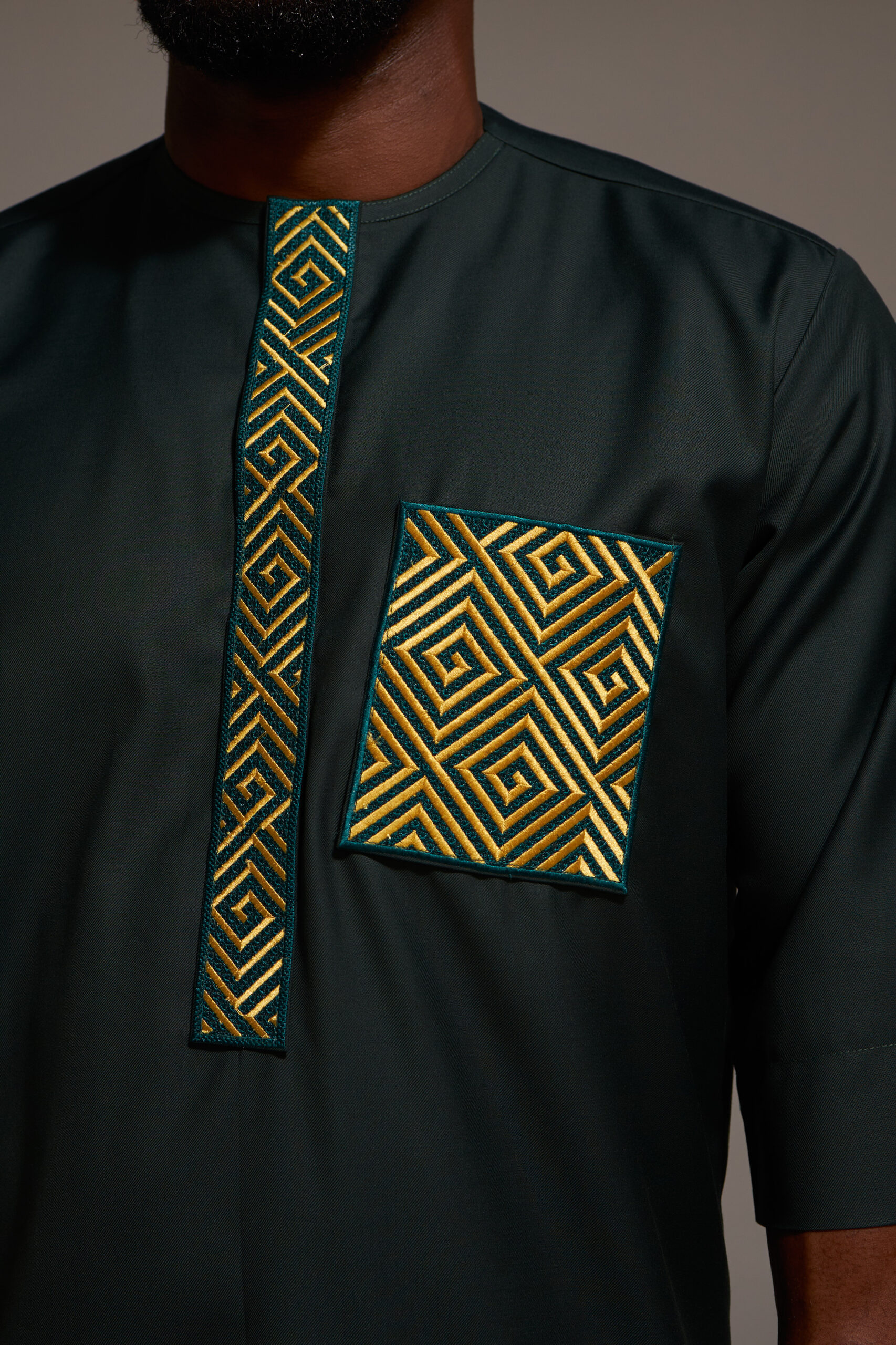 Green wool 3/4 sleeve kaftan, straight cut pants, embroidered placket and patch pocket