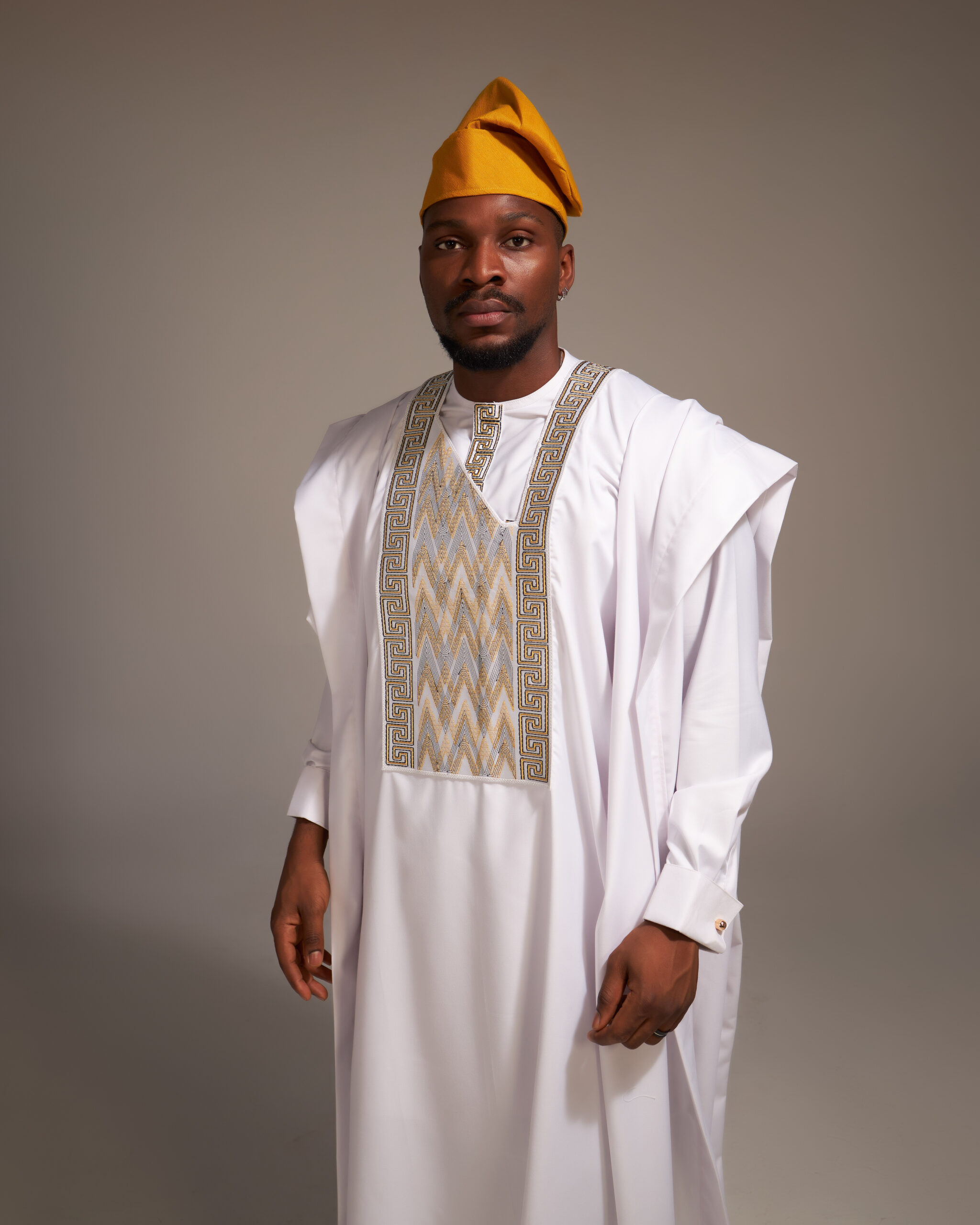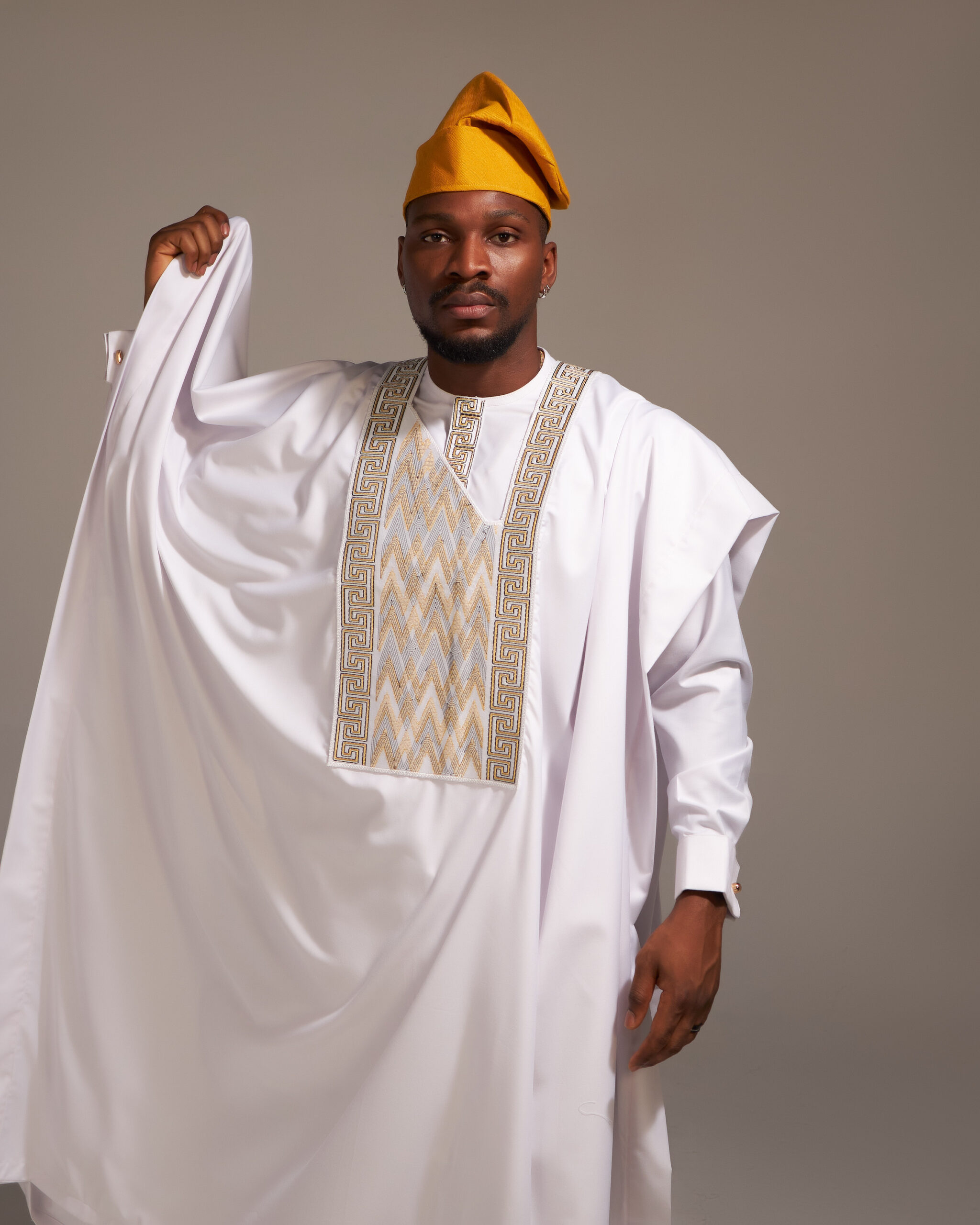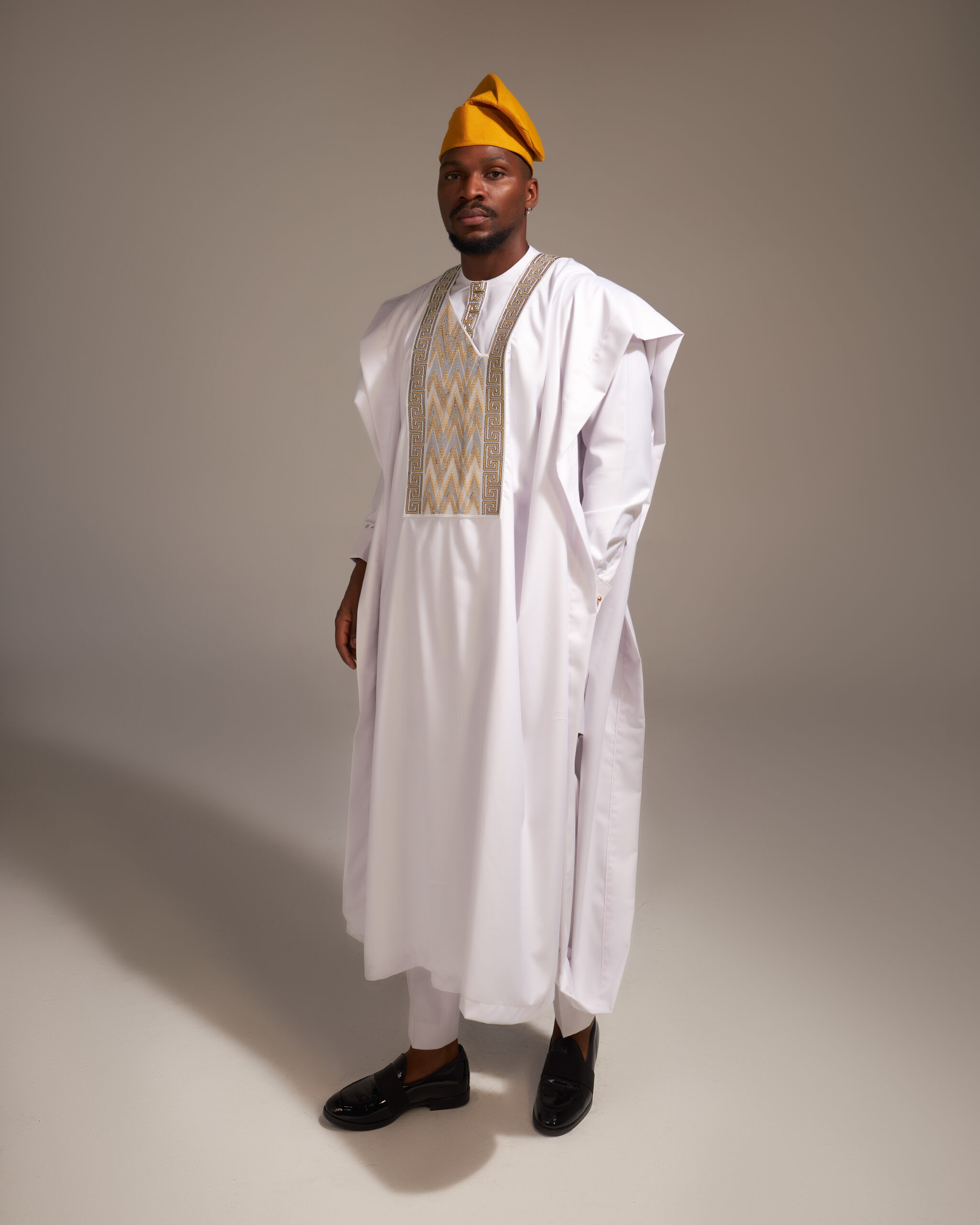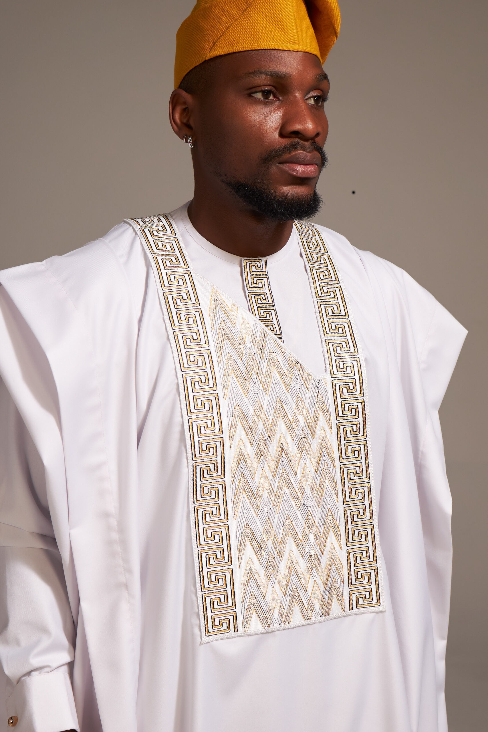 White wool Agbada, Long sleeve Kaftan Buba, Slim cut Sokoto pants